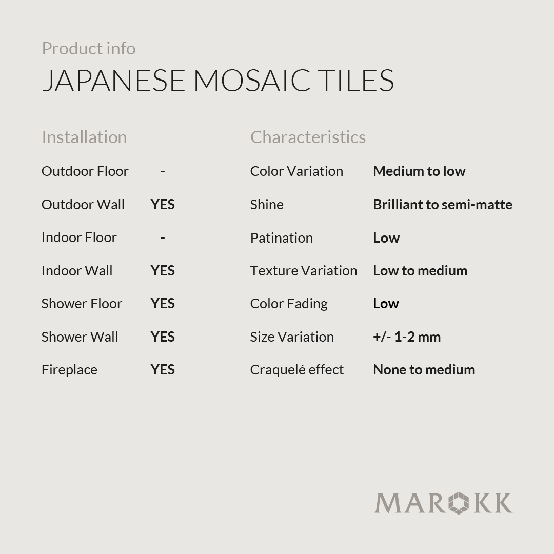 The large concave shape of the BAMBOO tile makes it ideal for larger wall surfaces, columns, counters, and areas that deserve a glazed finish. BAMBOO creates beautiful light reflections in any room with its softly rounded, concave glaze. Easy to install on both curved and flat surfaces in kitchens and bathrooms. Create an elegant and timeless design with mosaics from one of Japan's finest tile producers. The tiles are supplied mounted on mesh sheets measuring approximately 20x30 cm.