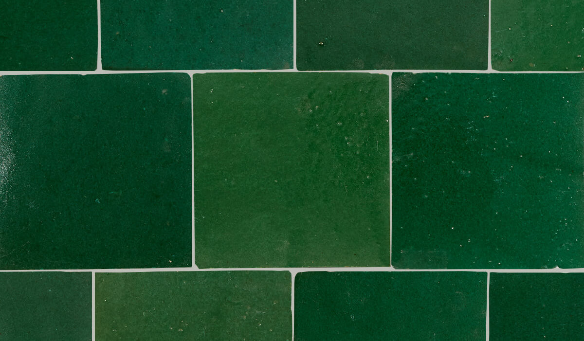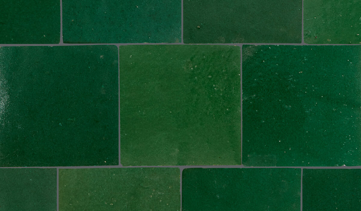 Deep glazes with multiple color variations from tile to tile. The centuries-old tradition of shaping, glazing, firing, and cutting Zellij tiles is still carried out by skilled artisans, entirely without modern tools and solely by foot and hand, as the clay is trampled and shaped. Expect unique glazes with a high degree of variation.