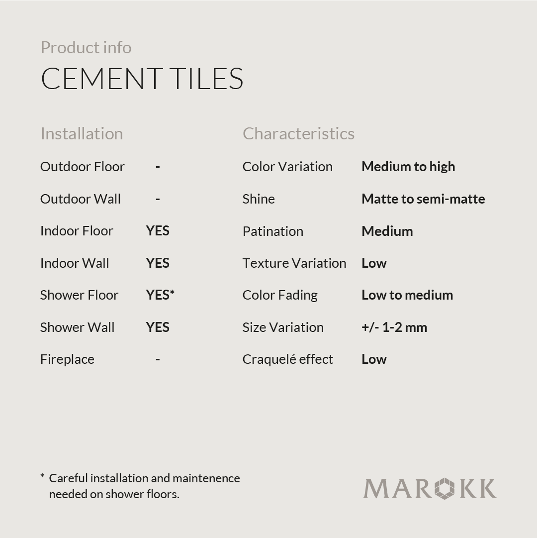 Large tile made from pure colored concrete, produced with the highest quality in a small factory on the outskirts of Marrakech's narrow streets. Cement tiles are prized for their matte, natural, dusty appearance, which develops a patina over the years. The tiles can be used on all indoor floor and wall surfaces after treatment with sealer and wax. For floors in wet areas, extra care is required through proper installation and maintenance—see our guide on this site.