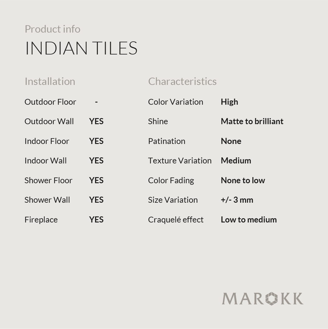 Handmade stoneware tiles produced in a small workshop in India. Our Indian collection is made using traditional techniques with mechanical pressing and hand-glazing of each tile. Due to the character of the clay and the long firing at high temperature, the Indian tiles are perfect for both floor and wall, including in wetrooms. A handmade stoneware tile of the highest quality, full of small imperfections and fired with traditional Indian glazes. Delivery time is 10-12 weeks and the minimum order quantity is 6 m2